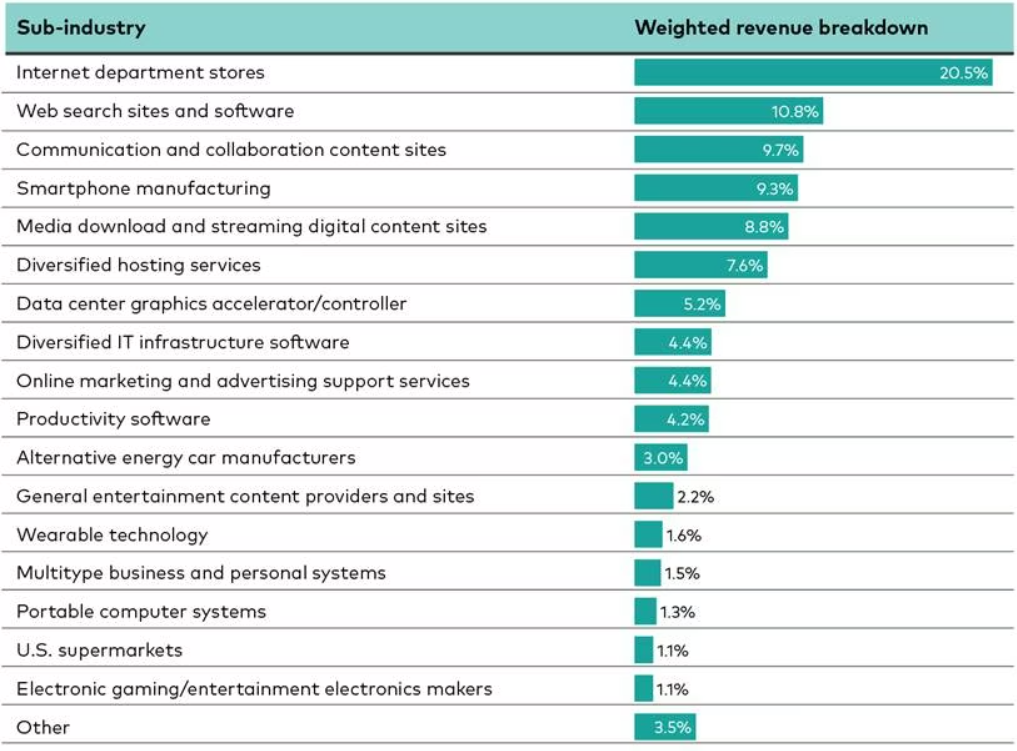 • Apple: Half its revenue comes from smartphone sales, one-quarter from media downloads and content streaming, and one-quarter from a mix of computer hardware, cloud storage, and wearable consumer electronics.